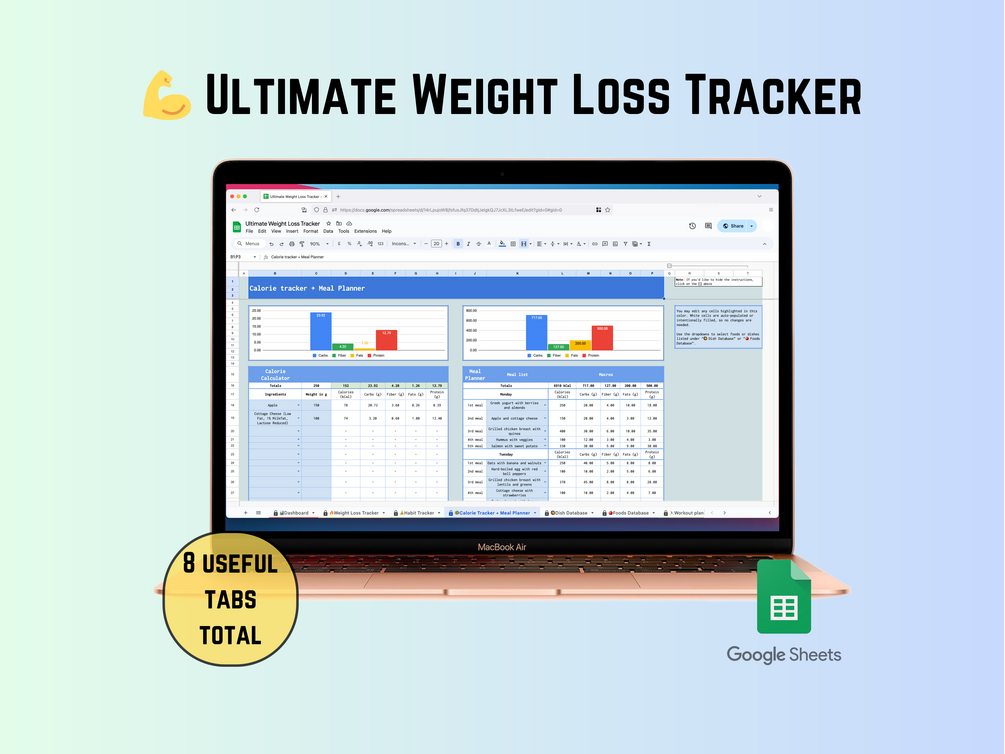Weight Loss Tracker - Planner for Daily Calories, Meals, Workouts (Google Sheets Template)